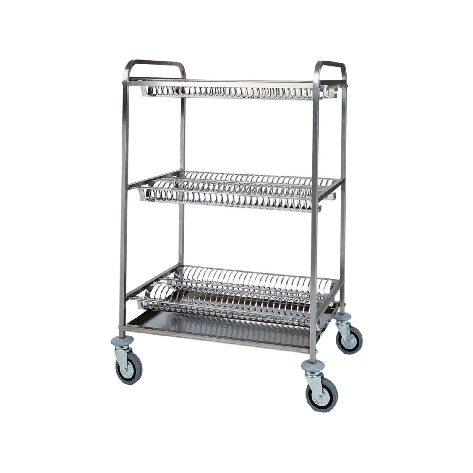Servierwagen zum Abtropfen von Tellern und Gläsern. Edelstahlrohrrahmen Edelstahl-Tellergestelle Tropfschalen aus Edelstahl – Schwenkräder: ø 125 mm.