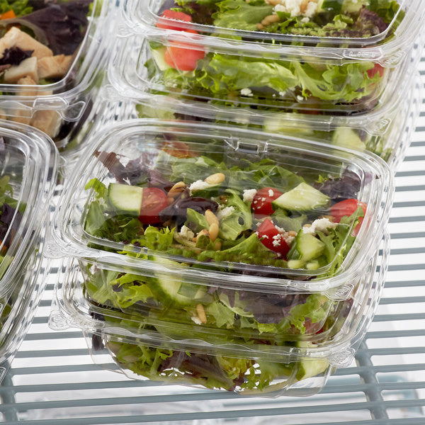 0742 141 099 Mit diesem klappbaren PET-Kunststoffbehälter mit hohem Deckel lassen sich verschiedene Lebensmittel sicher verschließen. Das manipulationssichere Scharnier bleibt fest am Behälter befestigt, wodurch lose Kunststoffteile sowie Schrumpffolie und Etiketten entfallen – das spart Ihrem Unternehmen Zeit und Geld und reduziert gleichzeitig Abfall. Verwenden Sie diesen Behälter zur Aufbewahrung von losen Lebensmitteln, Salaten, Obst und Gemüse in Ihrem Feinkostladen, an Ihrer Salatbar oder an Ihrer Theke.