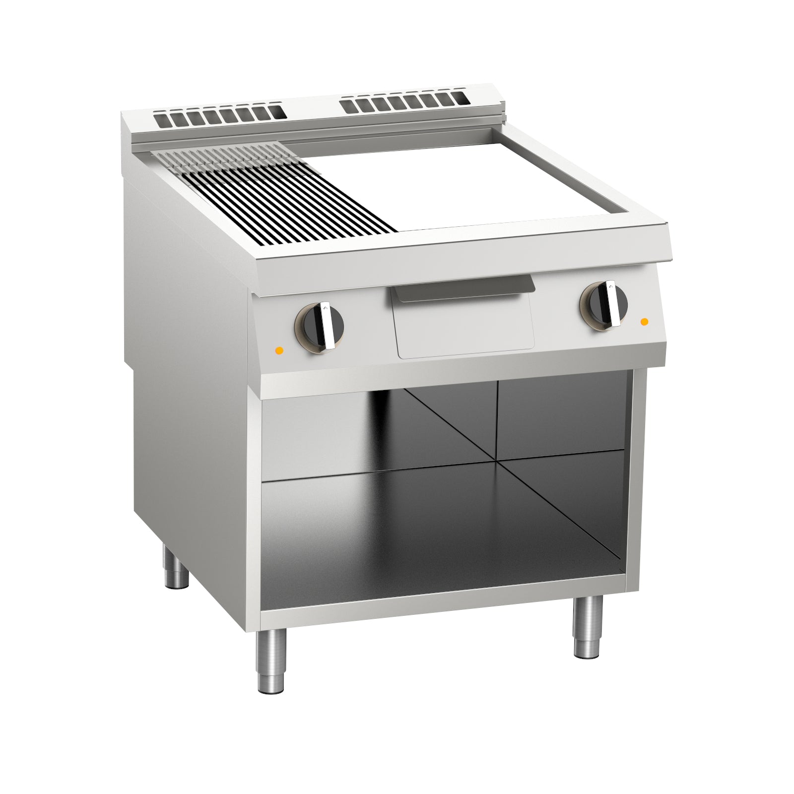 Die Gaskochfläche besteht aus Edelstahl AISI. Sie verfügt über separate Kochzonen mit geneigter Kochfläche, wahlweise in glatter, geriffelter oder gemischter Ausführung. Für unterschiedliche Kocharten stehen verchromter Stahl oder Edelstahl 430 zur Verfügung. Die Kochfläche ist im Verhältnis zum hermetisch abgedichteten Deckel tiefergelegt. Eine Fettauffangschale an der Vorderseite erleichtert die Reinigung – das Fett wird in einer speziellen Schublade im Bedienfeld gesammelt. Die Temperatur ist je nach Ausführung von 110 °C bis 280 °C einstellbar.