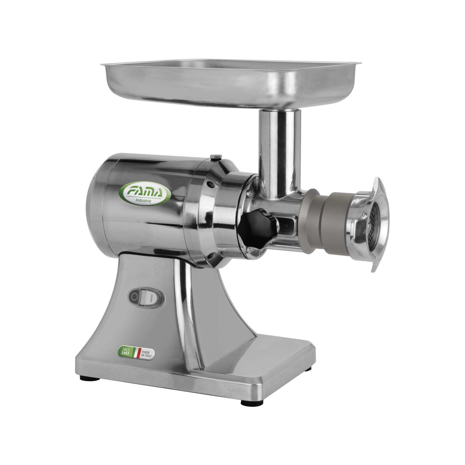 Der elektrische Fleischwolf dient zum Zerkleinern von frischem, nicht gefrorenem Fleisch und verwendet Schneidwerkzeuge zur Herstellung von Frikadellen und Würstchen. Das Fleisch darf keine Knochen oder andere Bestandteile enthalten, die nicht Fleisch sind. Die Maschine besteht aus einem Elektromotor, der in ein einteiliges Gehäuse (den Maschinenkörper) integriert ist. Bei einigen Ausführungen ist das Gehäuse mit einer Haube (dem Gehäuse) versehen. Das zu verarbeitende Fleisch wird manuell in die Einfüllschale im oberen Bereich der Maschine gegeben und mithilfe des Stößels manuell in den Mahlkanal zur Förderschnecke befördert. Der Einfülltrichter wird am Hals der Maschine verriegelt. Der Kolben besteht aus lebensmittelechtem Kunststoff. Die Mahleinheit ist in verschiedenen Ausführungen erhältlich: Standardmäßig wird das Modell Enterprise mit einer 6-mm-Lochscheibe, einer 1/2-Unger- oder einer Total-Unger-Scheibe geliefert. Die Scheibe wird mithilfe des Handrads am Einlauf der Mahleinheit auf das Messer gepresst. Die Mahleinheit ist zerlegbar. Alle Materialien, die mit dem Lebensmittel in Berührung kommen, entsprechen den geltenden Lebensmittelhygienevorschriften. Je nach Betriebs- und Produktionsanforderungen kann die Maschine mit verschiedenen optionalen Teilen ausgestattet werden.