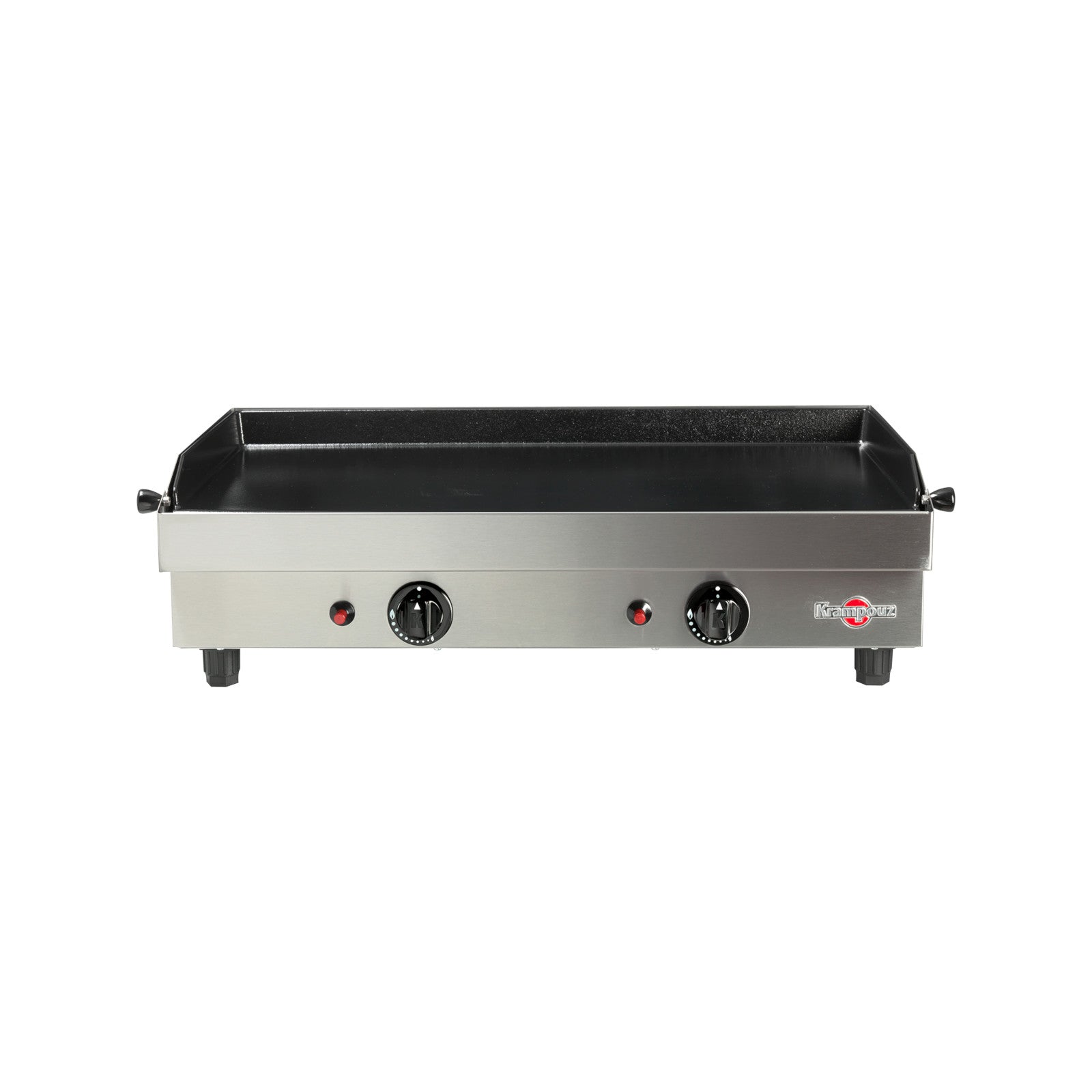 Das Krampouz Profi-Gaskochfeld verfügt über eine emaillierte Gusseisenplatte und arbeitet mit 6000 W für hervorragende Leistung und eine Gesamtkochfläche von 73 cm x 41 cm.