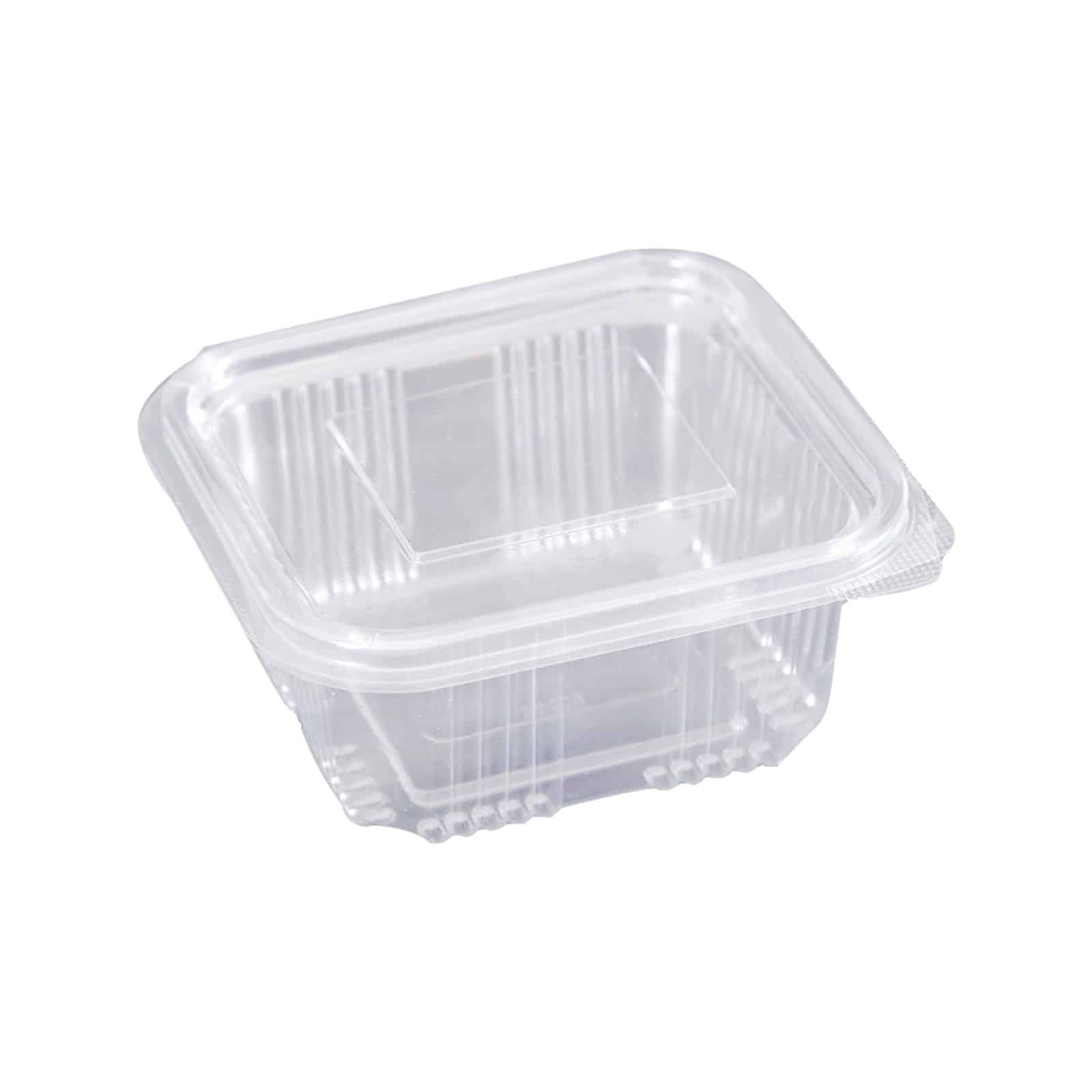 Securely seal a variety of food items with this hinged PET plastic container. The tamper-evident hinge of this PET plastic container stays attached to the container, eliminating loose plastic pieces and the need for shrink wrap and wrapping labels - saving your business time and money while reducing waste. Use this container to store bulk foods, salads, fruits and vegetables in your deli, salad bar or counter.
