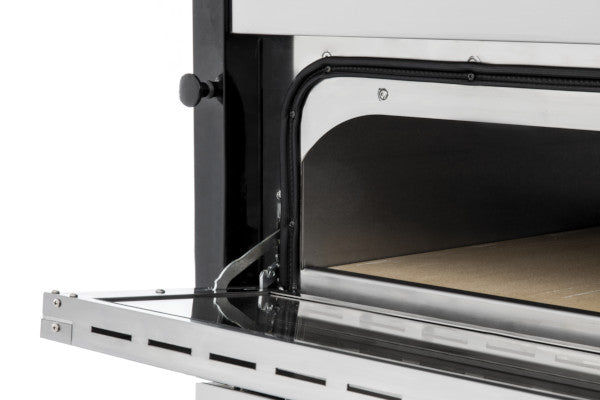 The ENDOR XL glass electric oven guarantees the best baking results thanks to its excellent features. It is equipped with: door seal for better insulation of the baking chamber, cooking surface in refractory stones, wrapped heating elements, internal lighting, rock wool insulation, large stainless steel handle, 4 cm thick door with double glazing, smoke outlet button. The oven is made of stainless steel and prefabricated steel. The design is enriched by a small hood, which makes the oven elegant. The standard power supply is 400 volts three-phase + neutral. Special voltages are available on request.