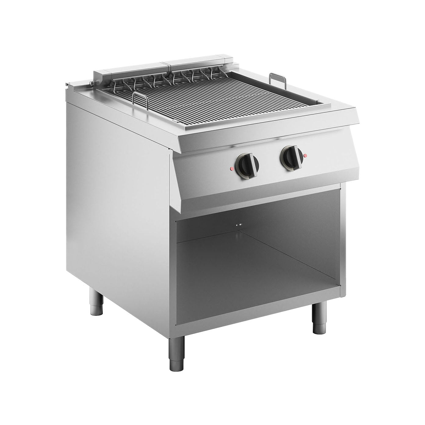 Controls located on the fixed front panel. Heating obtained with armored Incoloy resistors, positioned under the cooking grate, protected by the Aisi 316 stainless steel diffuser, easily removable for cleaning.