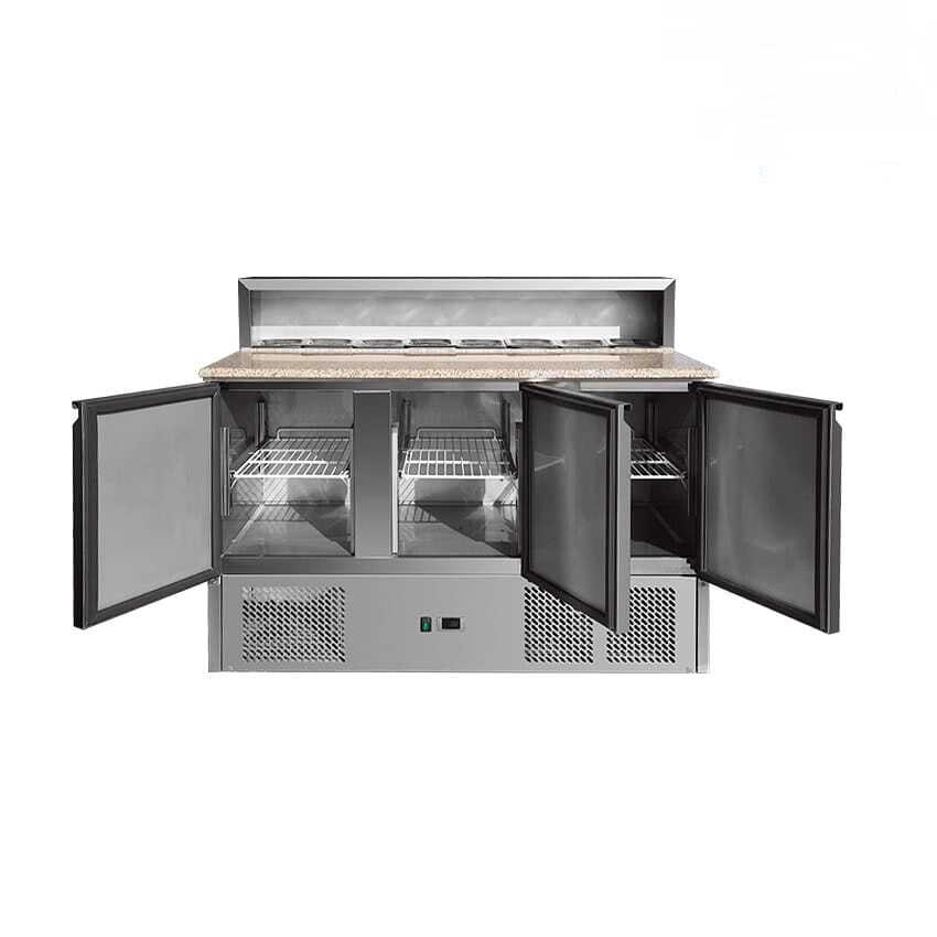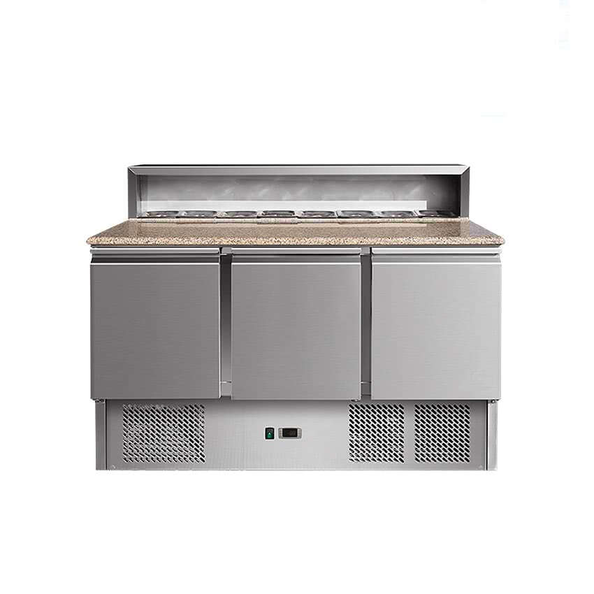 0784 111 212 Refrigerated table for pizza preparation, with 3 doors, a stainless steel superstructure, with a capacity of 8 GN 1/6 containers;