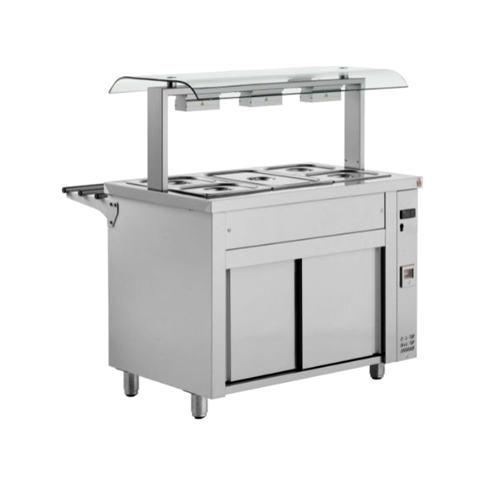 Bain marie cu dulap neutru închis, sneeze guard dublu, uși glisante.