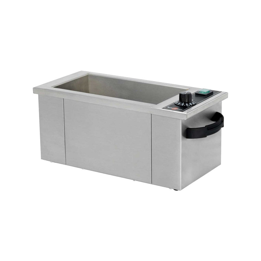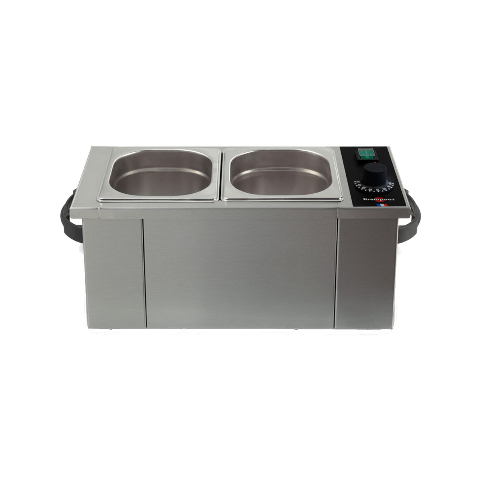 Acest bain-marie de blat compact poate ține două tigăi GN 1/6 (sau 1 tigaie GN 1/3) și se va potrivi perfect lângă un aparat de gătit pe blatul unei bucătării profesionale sau a unui camion de alimentare. Este prevazut cu un termostat care poate fi reglat de la 30 °C la 100 °C, ideal pentru păstrarea alimentelor calde. Marcajele de capacitate de pe baie vă permit să adăugați doar cantitatea potrivită de apă pentru o funcționare optimă.