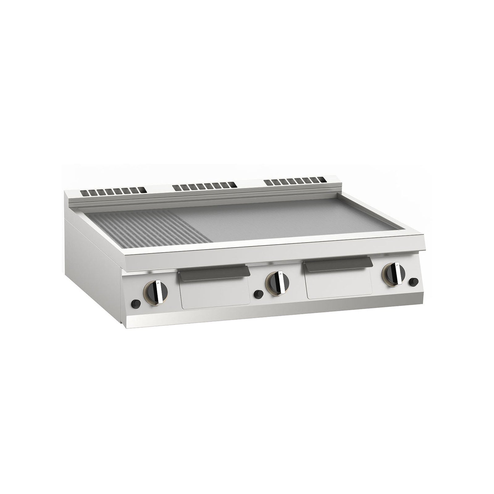 Fry-topul pe gaz de banc, linia 900, este fabricat din oțel inoxidabil Aisi. Este echipat cu zone de gătit independente cu plită înclinată, în variante netede, striate sau mixte. Oțel cromat sau inox 430 pentru diferite tipuri de gătit. Suprafață de gătit coborâtă, în raport cu blatul închis ermetic. Zonă frontală pentru grăsime pentru o curățare ușoară – grăsimea se depune într-un sertar special din panoul de control. Temperatura reglabilă de la 110 ° la 280 °, în funcție de versiuni.