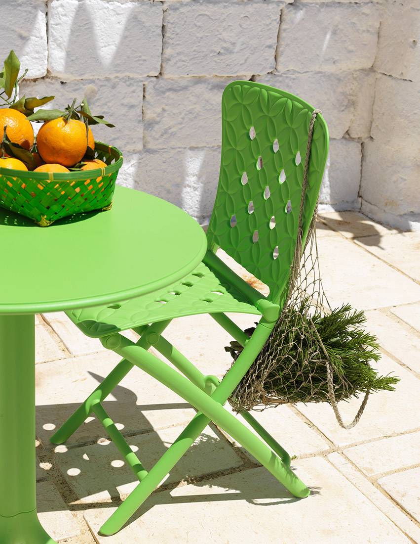 Masă joasă din polipropilenă cu fibră de sticlă, cu aditivi UV, cu partea superioară a suprafeței, rotunde și bază cu trei picioare, potrivită pentru utilizare în exterior, dar perfectă și ca mobilier interior.