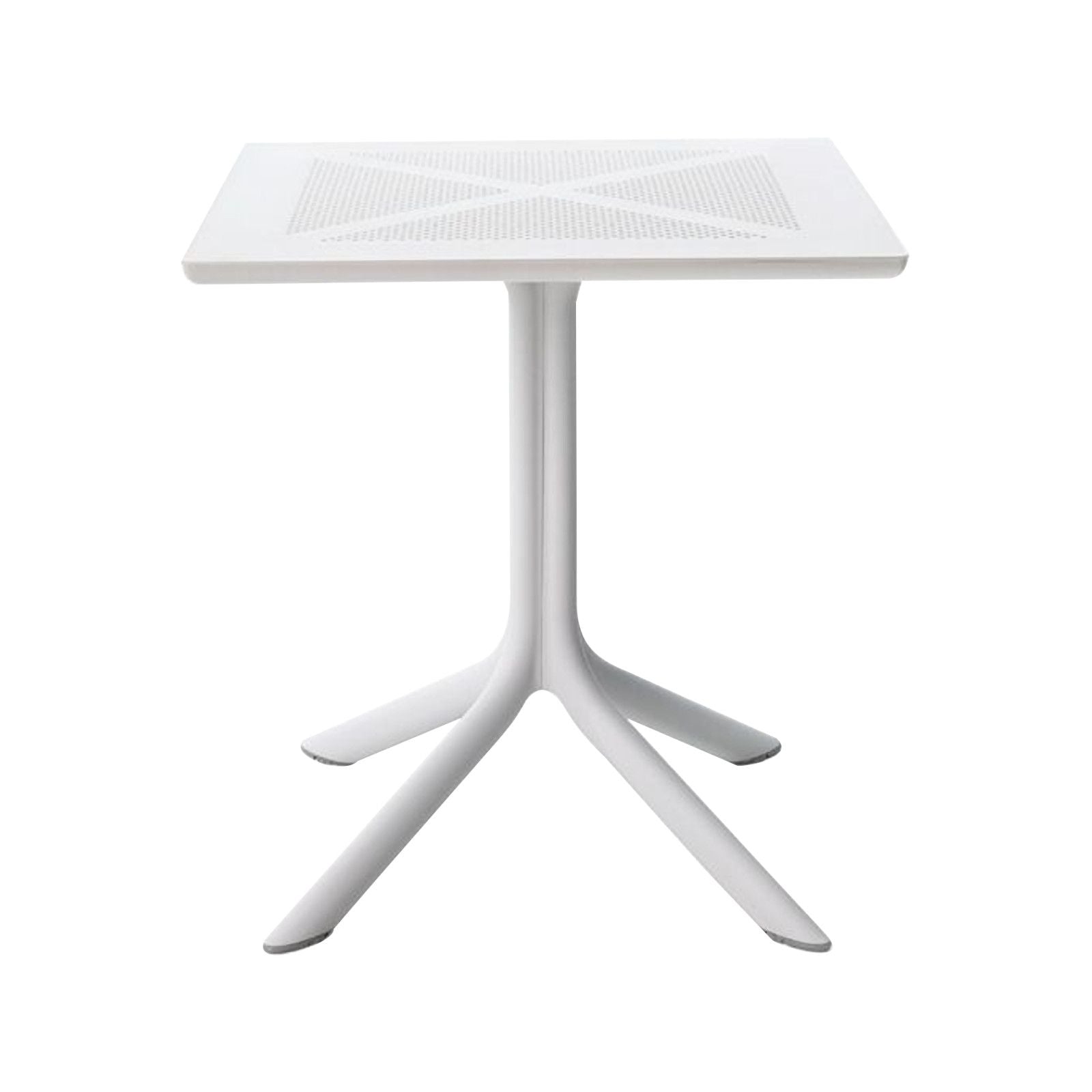 Special conceput pentru a ocupa foarte puțin spațiu, Clip este o masă pătrată profesională din polipropilena cu aditivi UV, suport central cu patru raze și masă DurelTop, gravată foto cu un model perforat.