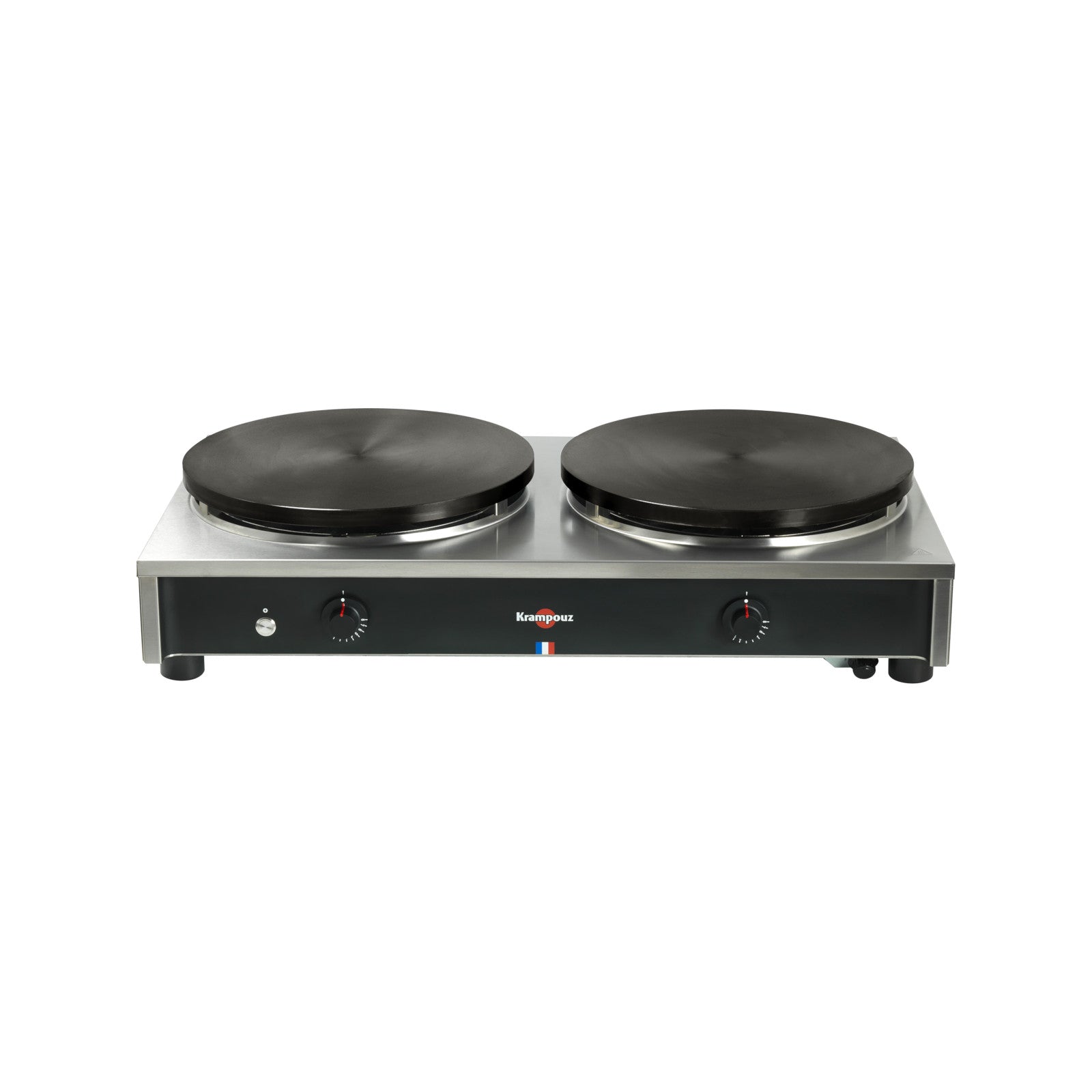 Plita este echipată cu două placi din fontă prelucrate care permit întoarcerea și acoperirea clătitelor pe o singura unitate.