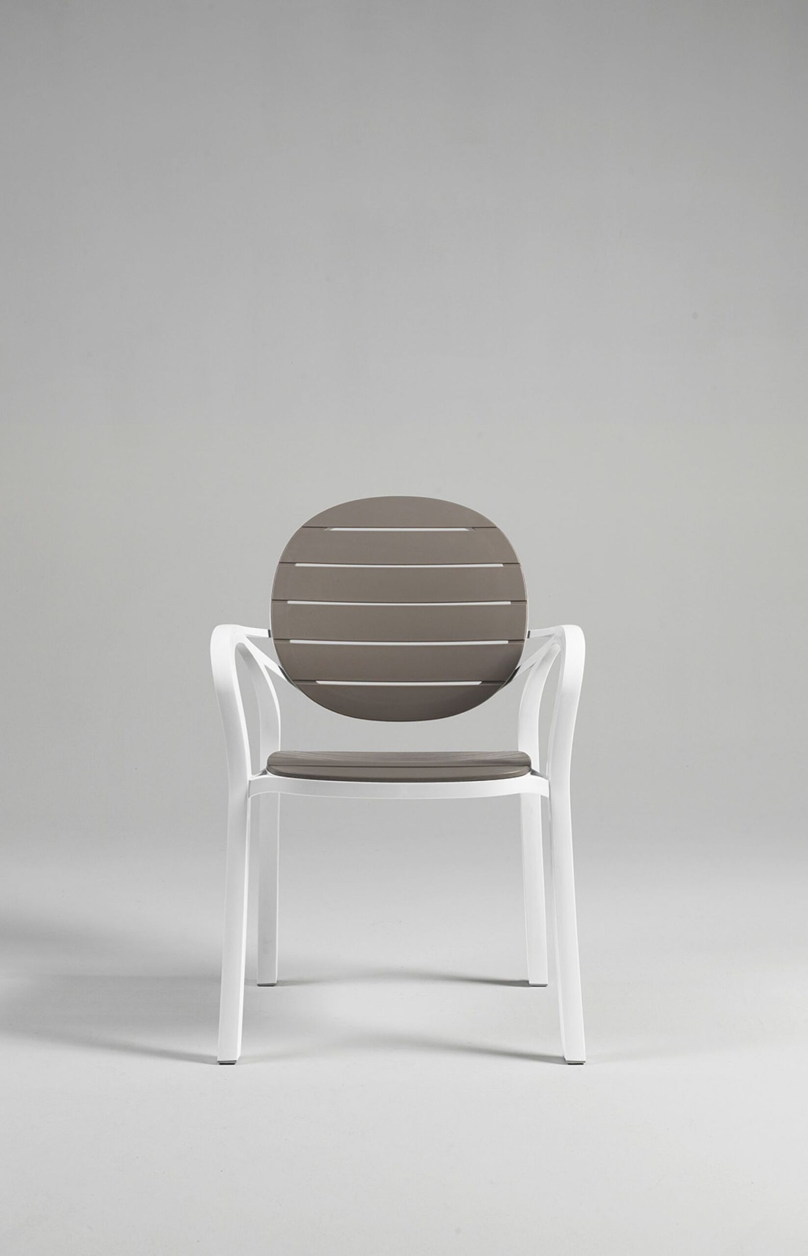 Scaunul PALMA are un aspect contemporan cu scaun și spătar cu șipci mari și prevazut cu cotiere.