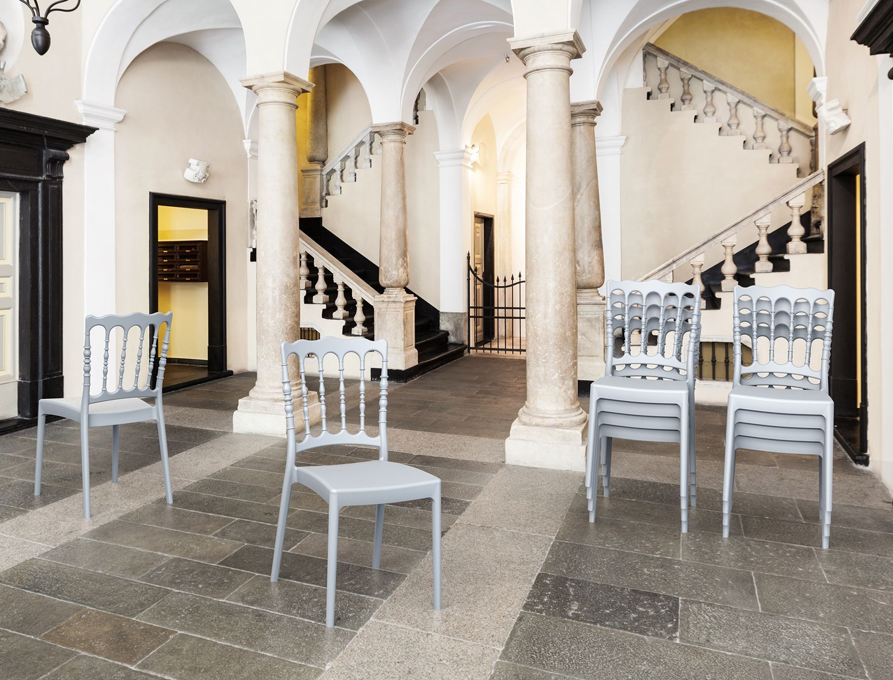 Scaunul de nunta Napoleon este produs dintr-o singura injecție de polipropilena armata cu fibra de sticla obtinuta prin intermediul tehnologiei de ultima generație de modelare cu aer cu tonuri neutre. Pentru uz interior și exterior.