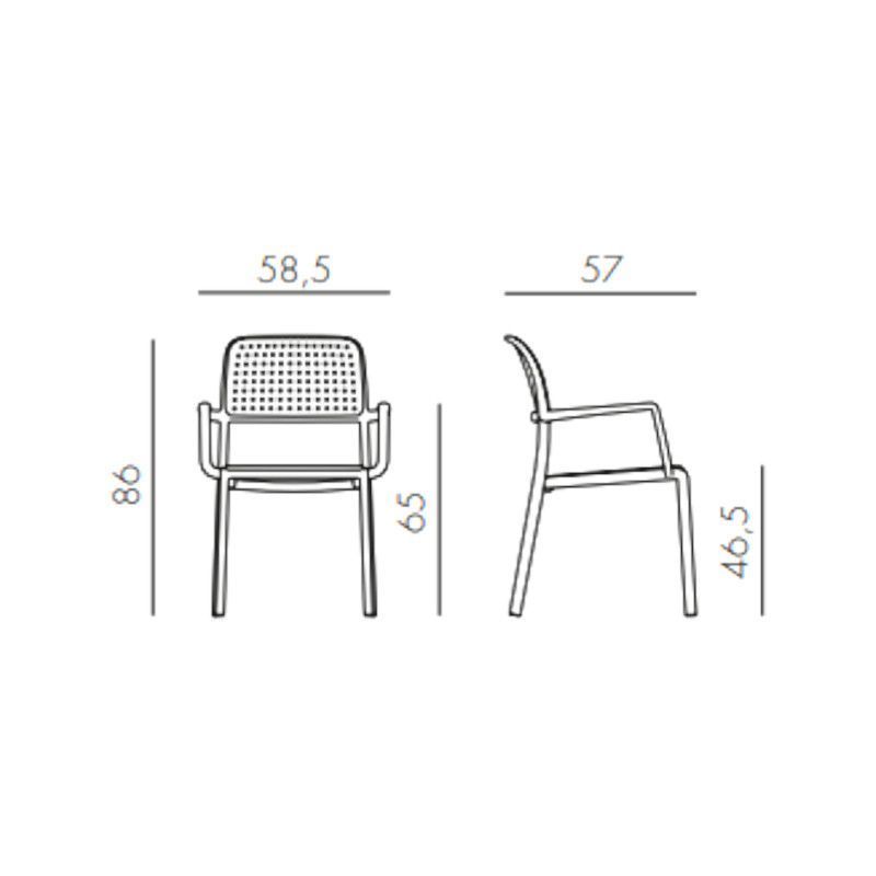 0784 111 212Bora este un fotoliu cu brate/cotiere confortabil, răcoros ușor și frumos din polipropilena cu fibra din sticla cu aditivi rezistenți la UV, cu un cadru tubular perfect și profil rotunjit.