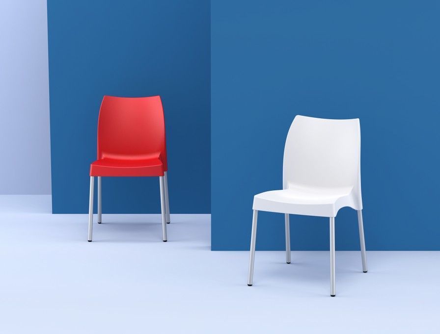 0784 111 212Scaun stivuibil cu șezut și spătar din polipropilenă și picioare din aluminiu cu diametru 25 mm.
