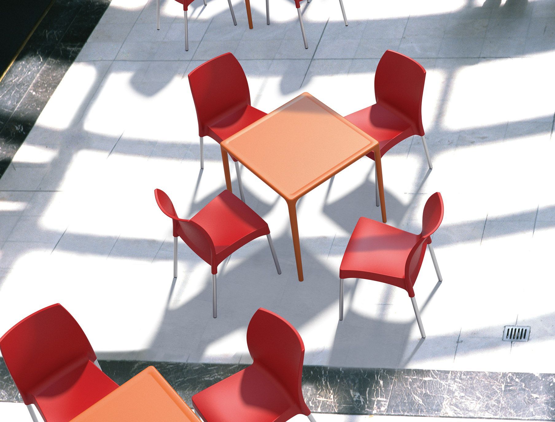 0784 111 212Scaun stivuibil cu șezut și spătar din polipropilenă și picioare din aluminiu cu diametru 25 mm.