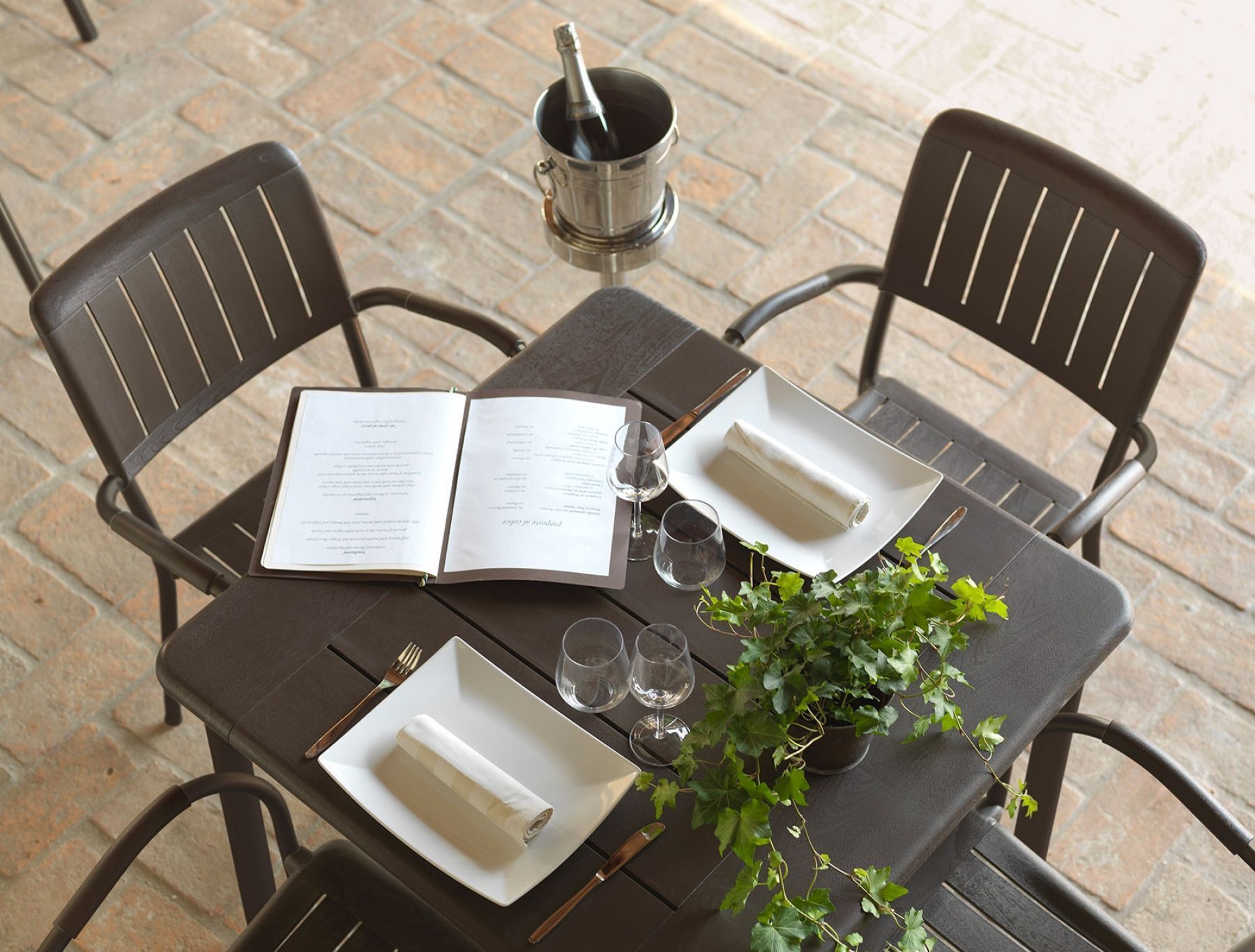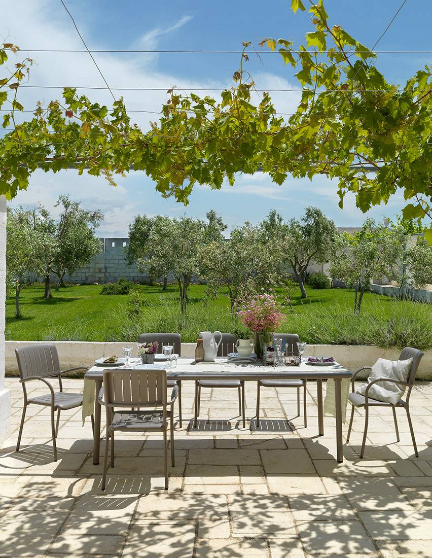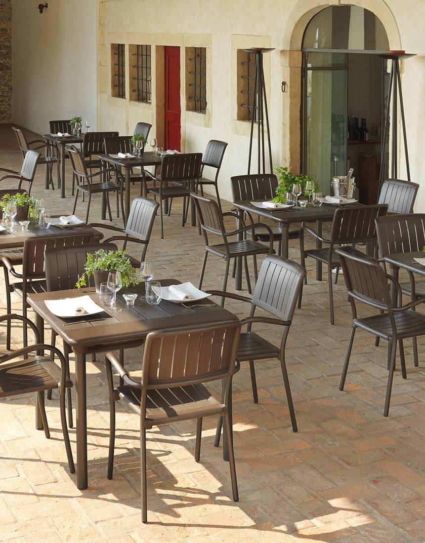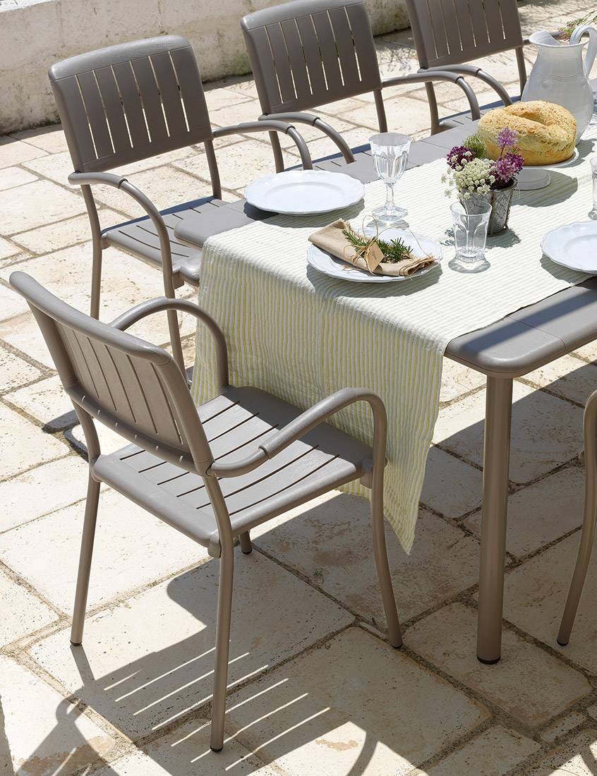 MUSA este un scaun din polipropilenă cu aditivi UV, mare și confortabil pentru utilizare în exterior, cu cotiere și picioare din aluminiu vopsit.