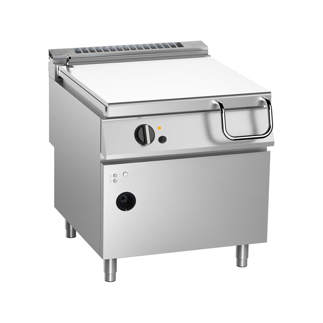 Rezervor de gătit cu mecanism de înclinare manual/automat, construit din oțel inoxidabil, în formă dreptunghiulară, cu colțuri radiate pentru o curățare ușoară.