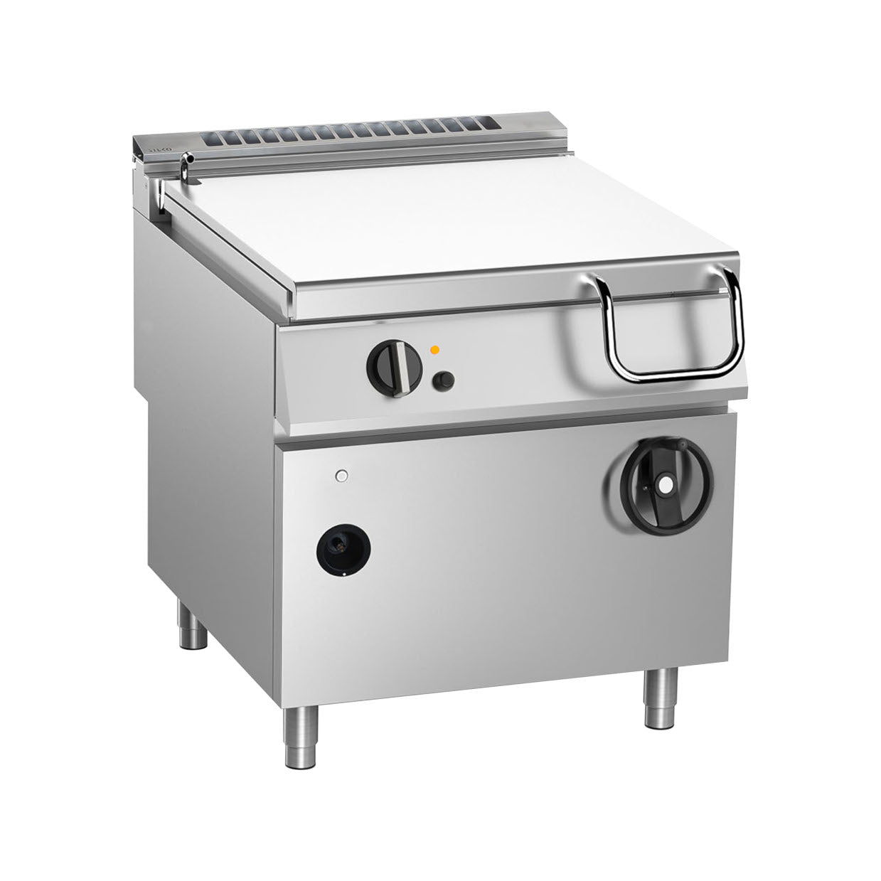 Rezervor de gătit cu mecanism de înclinare manual/automat, construit din oțel inoxidabil, în formă dreptunghiulară, cu colțuri radiate pentru o curățare ușoară.